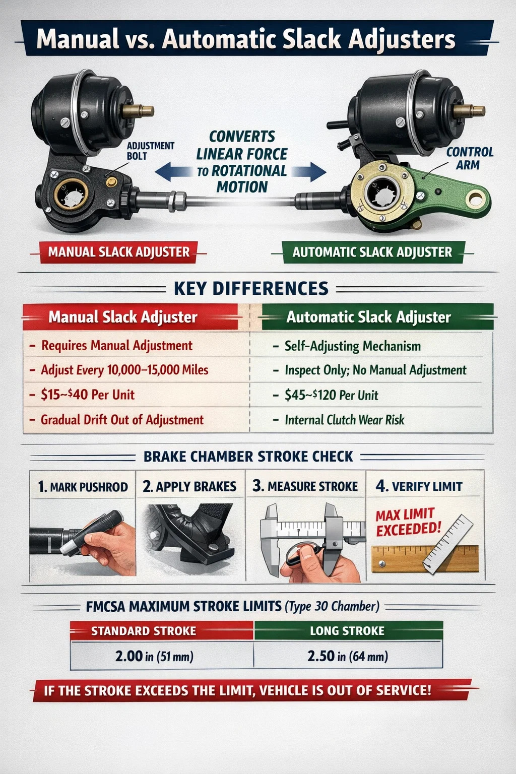 Ručni regulatori labavosti zahtijevaju da tehničar fizički okrene vijak za podešavanje - obično šesterokutni priključak od 9/16 inča - kako bi zakrenuo pužni zupčanik unutar tijela regulatora i promijenio položaj bregastog vratila kočnice. Ne postoji mehanizam samoispravljanja. Ako se vozač ili tim za održavanje voznog parka ne pridržava planiranog intervala pregleda, prilagodba izlazi iz specifikacije kako se obloga troši. U operacijama s velikom kilometražom, to se može dogoditi unutar jednog tjedna servisa.