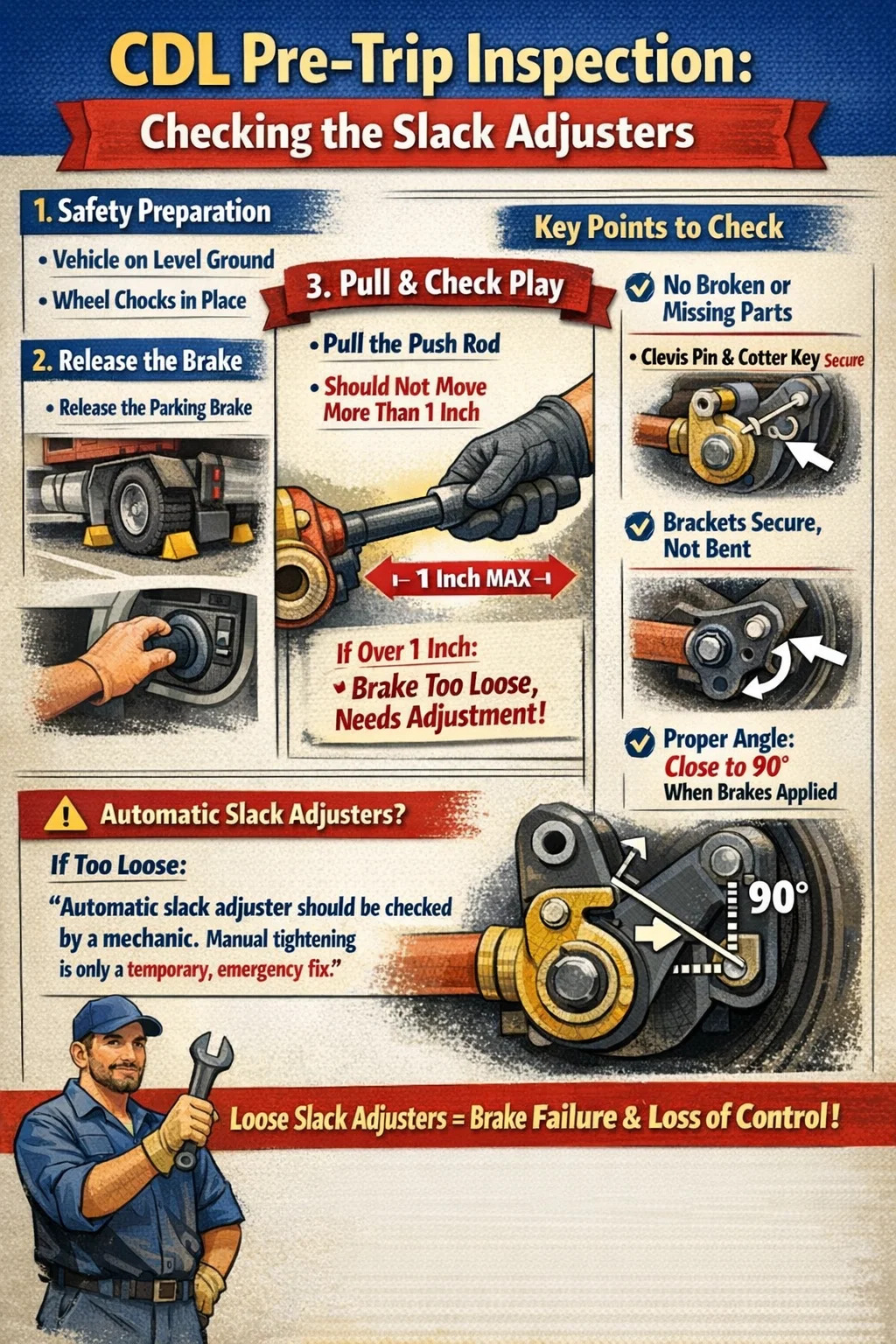 U postupku stjecanja komercijalne vozačke dozvole (CDL), pregled prije putovanja ključan je dio, a pregled regulatora labavosti jedna je od stavki na koje se ispitivači najviše usredotočuju.